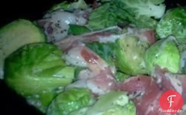 Im vorgeheizten Ofen braten, bis der Speck knusprig ist und Rosenkohl karamellisiert ist, 45 Minuten unter halbem Rühren.